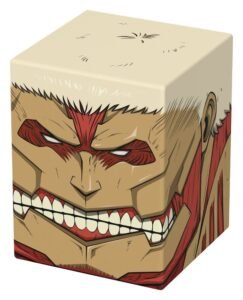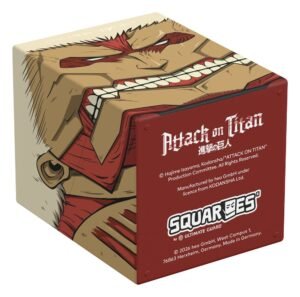 Collectible box for storing TCG decks, tabletop gaming accessories, and/or collectibles. The Armored Titan Squaroe from the Attack on Titan edition holds up to 100 cards in double protective sleeves if used as a deck box. Squaroes are made from 78% renewable resources and fit perfectly into the separately available Collectors Case.