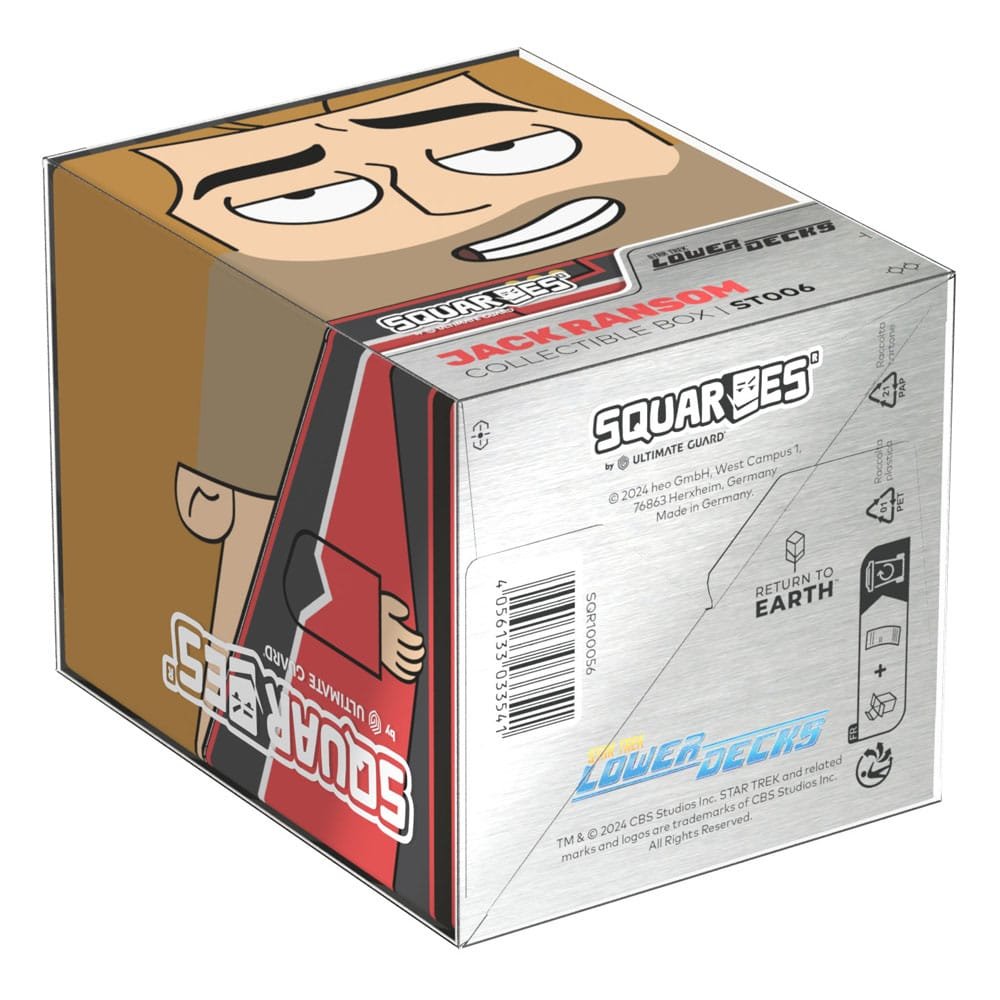 Collectible box for storing TCG decks, tabletop gaming accessories, and/or collectibles. The Jack Ransom Squaroe from the Star Trek: Lower Decks™ edition holds up to 100 cards in double protective sleeves if used as a deck box. Squaroes are made from 78% renewable resources and fit perfectly into the separately available Collectors Case.
