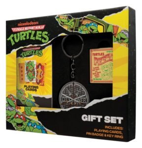 “Grab yourself a slice of turtle power! This Teenage Mutant Ninja Turtles Gift Set is the perfect bundle for any fan of the iconic TMNT franchise. Inside the box, you’ll find a metal pizza slice keyring worthy of any late-night snack run, a pizza box pin badge straight out of the Turtles’ favourite hangout, and a special deck of TMNT playing cards featuring unique artwork made for totally action-packed game nights.