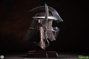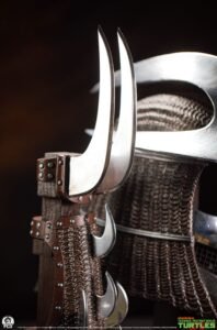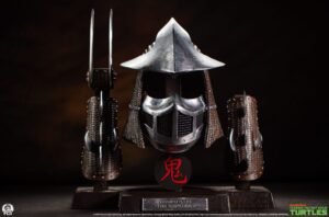 Standing 21″ tall displayed on a 21.5″ wide base the Shredder Armor Set showcases the leader of the Foot Clan’s signature armaments including his helmet, bracers and dual-clawed weapon. The set is arranged neatly on a faux-wooden base with a metallic name plate to elevate your TMNT display to museum status.