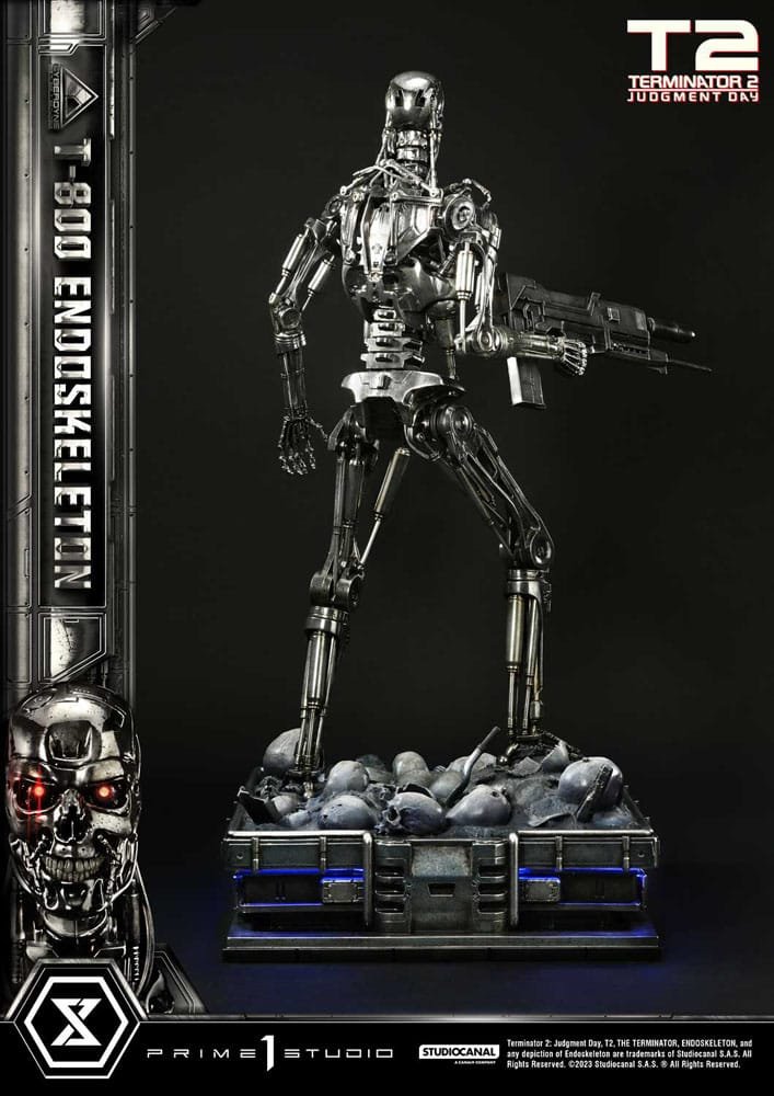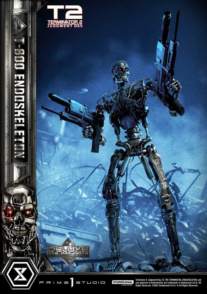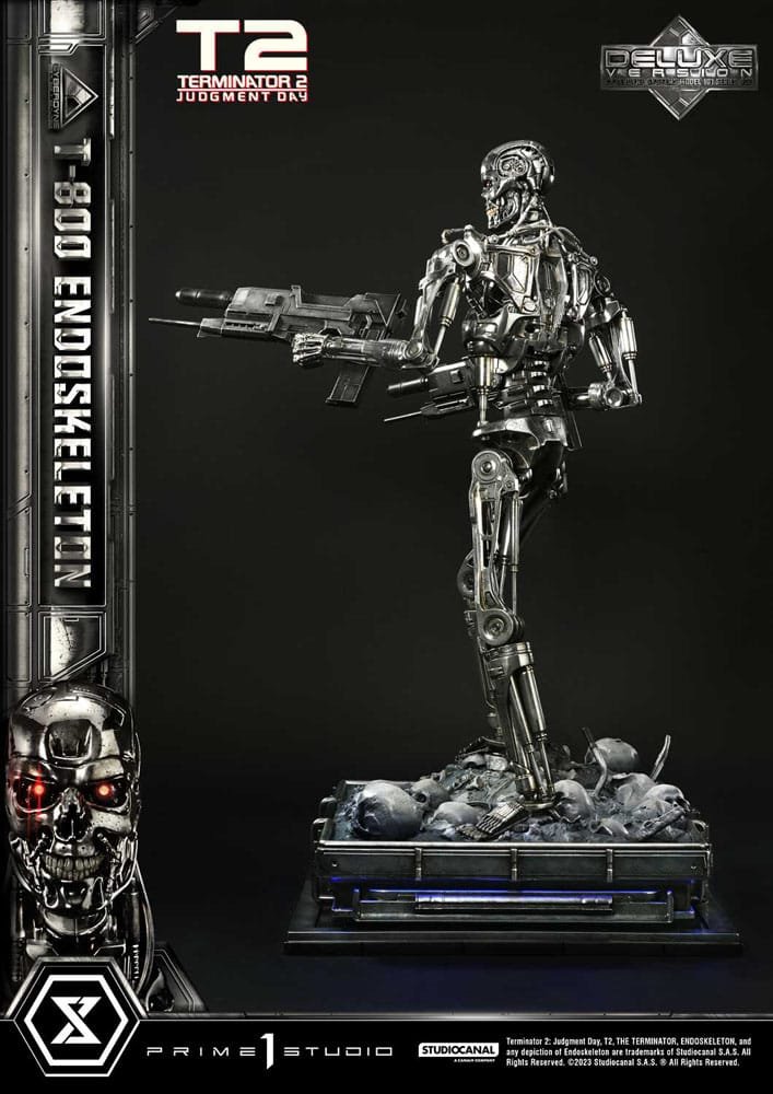 The Deluxe Version offers a deeper dive into the machine’s infiltration capabilities. Switch out the left hand with another plasma rifle-wielding hand to show your terminator ain’t metal-ing around! The “Terminator 2 Judgment Day” logo plate is also included with the Deluxe Version to pay homage to the sequel’s enduring legacy. This version magnifies the chilling aura of the T-800 Endoskeleton, transforming it into a centerpiece of unparalleled horror.