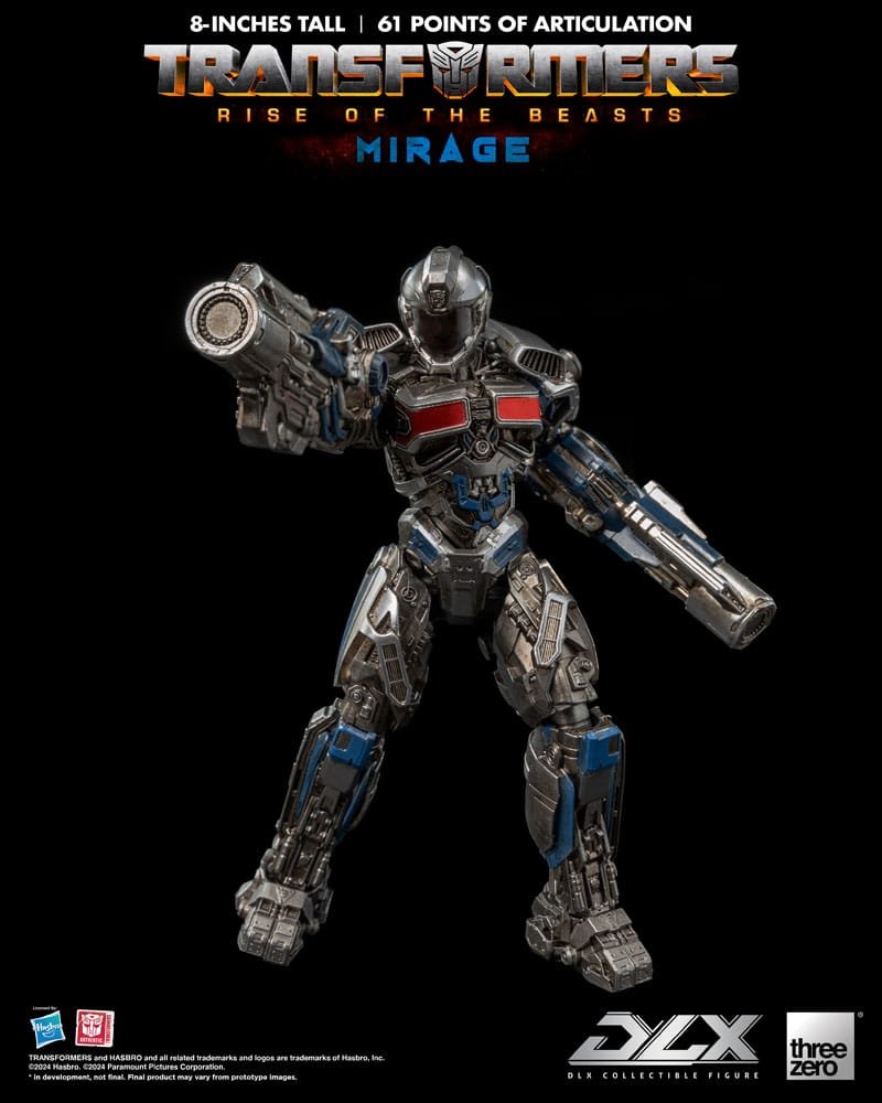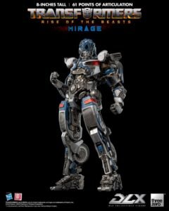 Transformers: Rise of the Beasts DLX Mirage is a highly detailed and fully-articulated collectible figure of the fast-talking Autobot Mirage. This 8″ (20.32 cm) tall figure boasts engineering grade plastics with a die-cast metal frame that provides enhanced durability and an incredible range of articulation, approximately 61 ponts, allowing for dynamic posing and display. The weathered paint application captures the battle-worn aesthetic of this heroic Autobot.