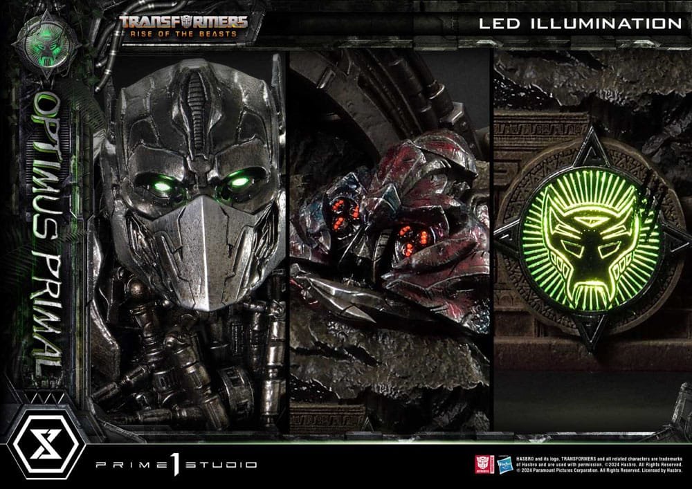 Standing at an impressive 35 inches tall, this statue captures Optimus Primal in his formidable form, each hand gripping a bladed weapon, ready for battle. He stands atop intricately detailed ruins inspired by the film’s terrain. Prime 1 Studio artisans have gone to great lengths to offer you a masterpiece of craftsmanship and detail. Every aspect is designed to captivate and impress, from the meticulously rendered textures of Optimus Primal’s armor and fur to the vibrant, movie-accurate colors. We’ve added LED illumination features in the base of the iconic Transformer logo at the front, as well as Scorponok’s eyes, whose head lies severed at Optimus Primal’s feet, and Optimus’s eyes, for a lifelike glow that enhances his imposing presence.