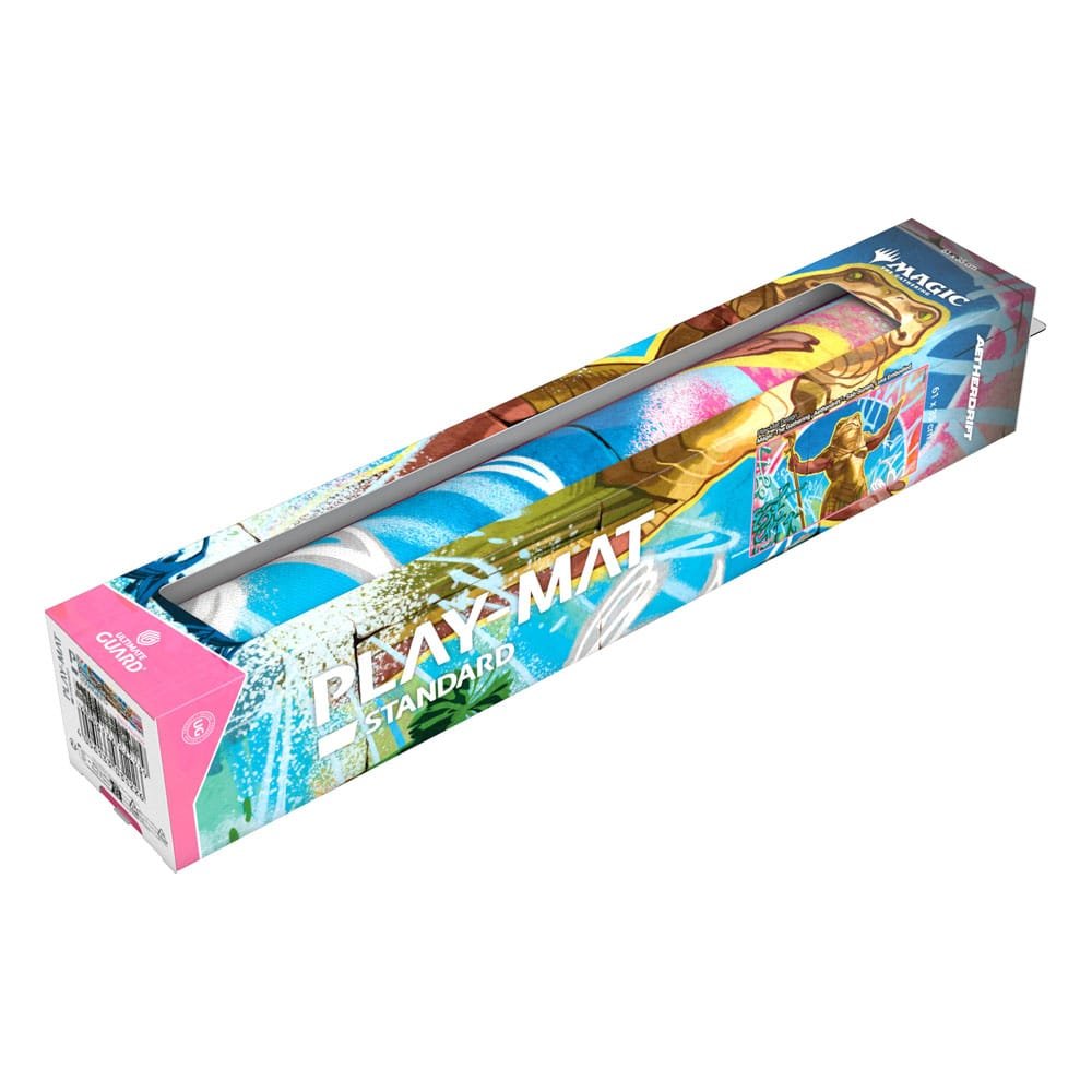 The Play-Mat in the standard size 61x35cm shows officially licensed artworks from Magic: The Gathering’s set Aetherdrift. The soft cushioned Play-Mat with non-slip underside improves the gaming experience, protects gaming cards and accessories, and is even more durable than classic Play-Mats thanks to its stitched edges.