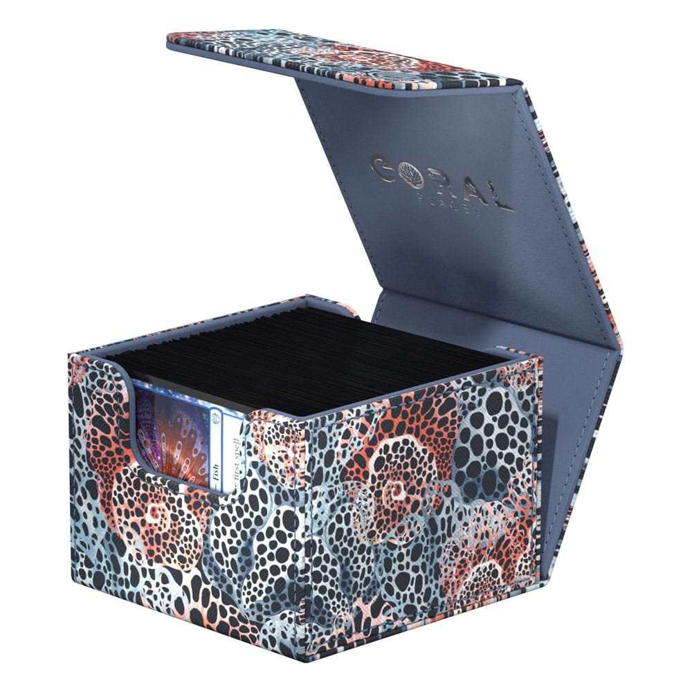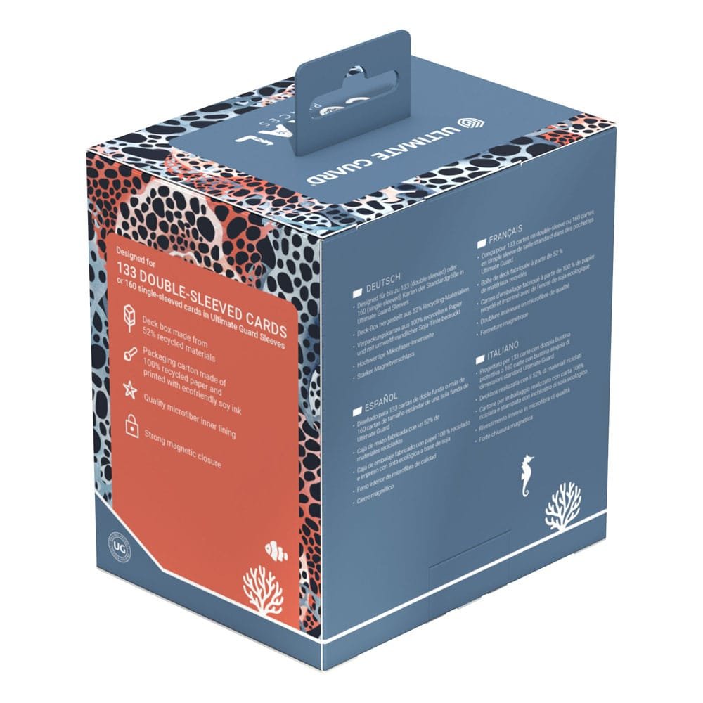 Dive into flourishing underwater worlds with Ultimate Guard’s Coral Places Sidewinders! The sustainable deck boxes are made from 52% recycled materials and, in addition to the durable Xenoskin surface, have a strong magnetic closure and a high-quality microfibre inner lining. With a capacity of 133 double-sleeved cards*, it’s the perfect MTG deck box for your Commander deck with extra space for tokens! The plastic-free packaging is also made entirely from recycled paper and cellulose-based film.