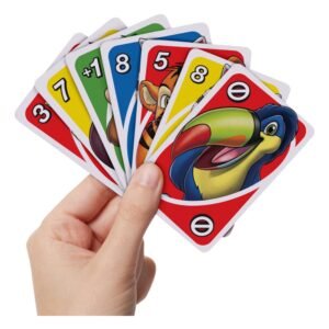 This simplified UNO card game for younger players has multiple levels of play so kids can grow with the game. Cards feature adorable zoo animal graphic for each number 0 through 8, making matching easy for kids as young as 3 years old. Three levels of play allow the game to keep pace with a child’s development. Players race to get rid of all their cards by matching them to the card shown on top of the deck, either by color or by animal / number. When you’re down to one card, don’t forget to yell ‘UNO!’ Colors and decorations may vary.