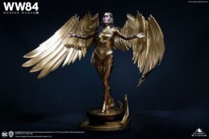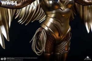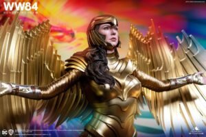 The 1:4 scale Wonder Woman 84 collectible statue is available in two editions, both meticulously sculpted in Gal Gadot’s likeness. The Regular Edition features Wonder Woman wearing the Golden Eagle Helmet. While the Premium Edition features a full portrait of the character with her flowing hair draped down over her shoulder. Diana’s eyes are focused and she has a determined look.