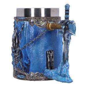 “Embrace the dark power of Azeroth with the officially licensed World of Warcraft The Lich King Tankard. This exquisitely designed tankard showcases the legendary Helm of Domination alongside the Ice Crown Citadel making it a must-have for any World of Warcraft fan. The tankard’s handle is crafted to resemble Frostmourne, the fearsome two-handed sword that carries an aura of mystery and terror. Expertly cast in high-quality resin and meticulously hand-painted, this tankard offers a stunning level of detail that brings the chilling essence of The Lich King to life.